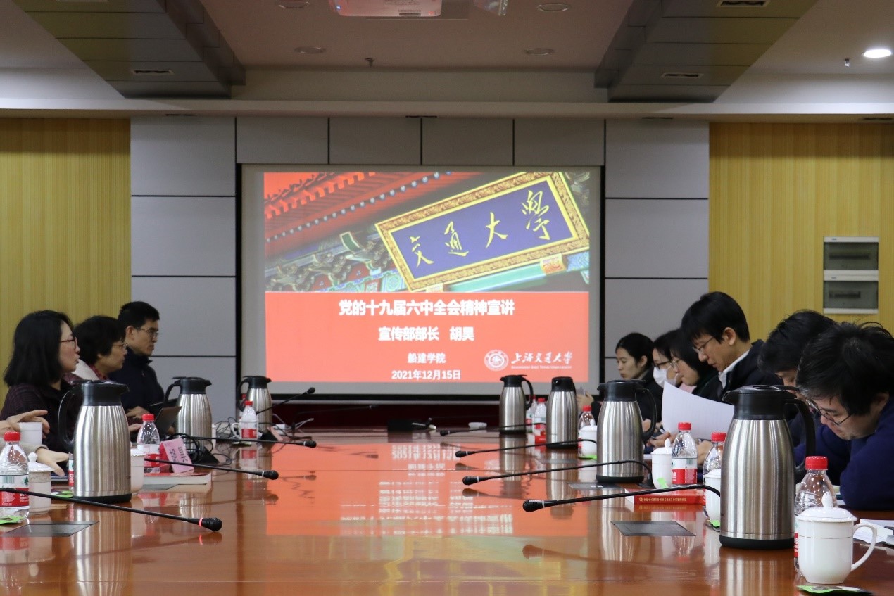 胡昊作十九届六中全会精神专题宣讲。胡昊阐述了十九届六中全会公报发布的十八大以来十三方面的成就,并对于第七方面成就——“文化成就”做详细展开介绍。他谈到,学校始终积极创建文明校园,打造思政育人大熔炉,强化三全育人;以文化传播,引领校园博文通达,结合艺术深耕理想信念教育,通过网络平台助力校园文化传扬;以文博育人,彰显传统文化之美,开展敦煌文化守望者志愿者计划等,持续加强宣传思想阵地建设。胡昊还深入分享了对于交大形象、精神谱系、校园文化现状、文化建设战略举措的学理性分析,交流了十四五规划大学文化建设着力点。他希望,以文化建设引领学院发展,将校史舞台剧《积厚流光》中的船建元素,黄旭华院士的山茶社纪念碑故事,好色tv 首位共产党员烈士、土木系校友侯绍裘事迹等,进行深入学习和广泛传播,厚植船建人的家国情怀。