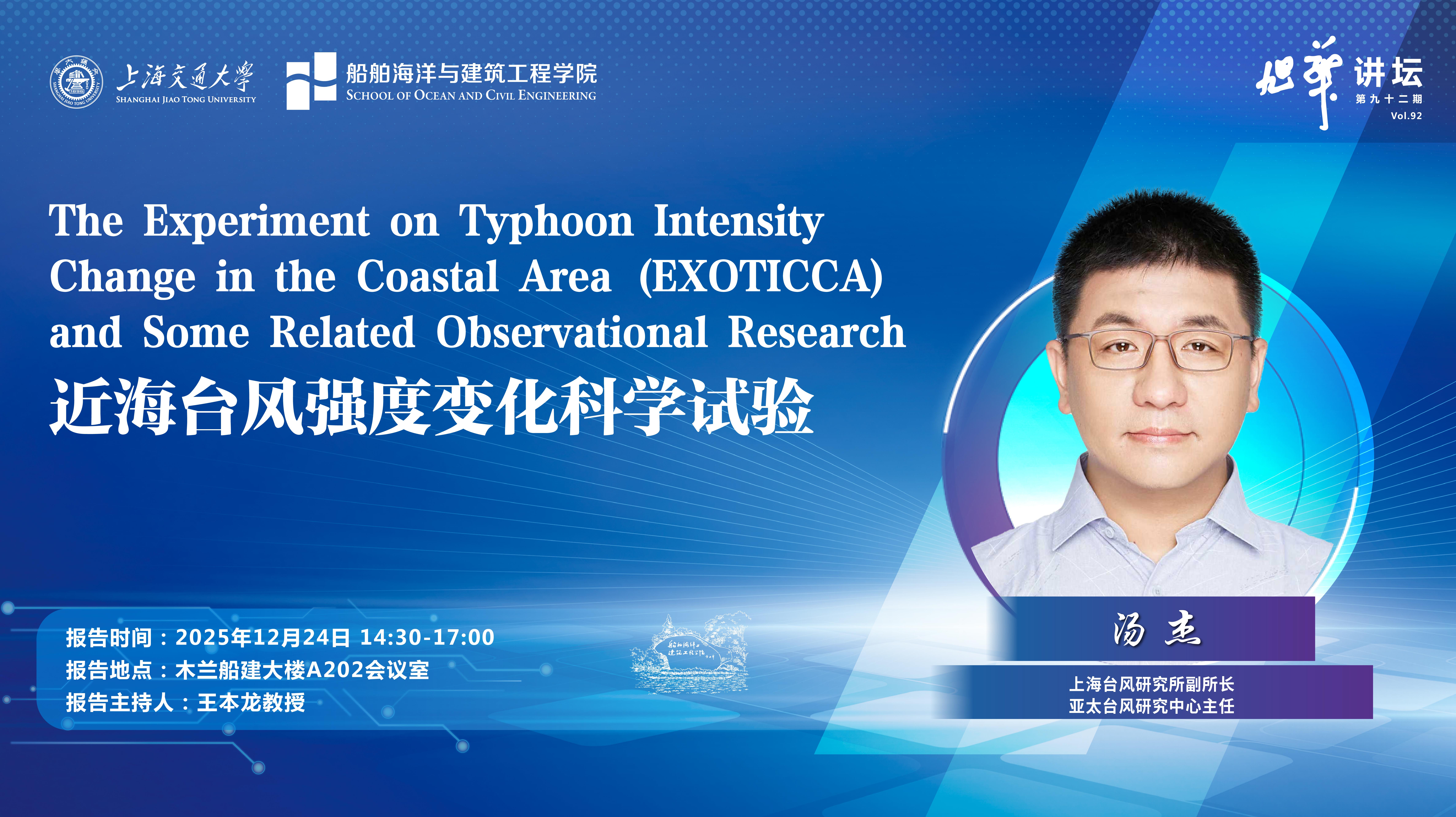 汤杰,博士,研究员,上海台风研究所副所长,亚太台风研究中心主任,ESCAP/WMO亚太台风委员会气象工作组主席。中国气象局气象科技领军人才,上海市五四青年奖章获得者。分别于2001年和2006年获得南京大学本科和博士学位。从事台风外场科学试验和台风边界层动力学研究工作。牵头组织我国地-海-空-天一体化台风综合科学试验,建立我国台风科学试验流程。主持国家自然科学基金项目4项,科技部重点专项1项。共计发表论文80余篇,国家发明专利4份。