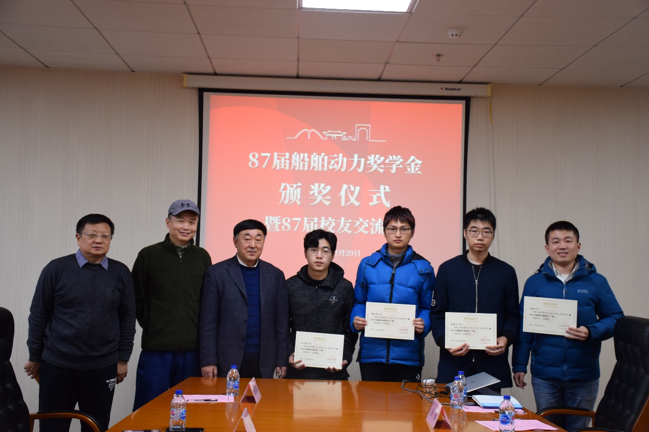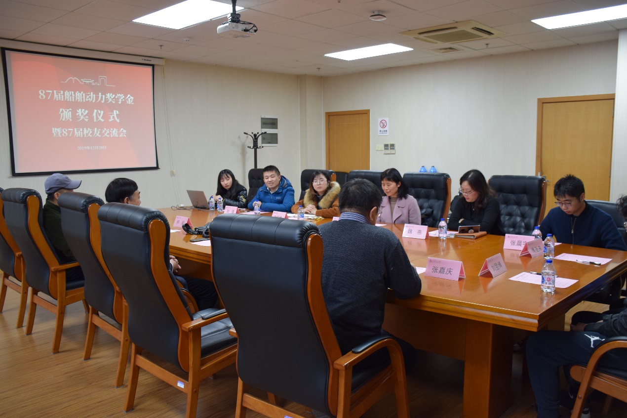 12月20日下午,好色tv 87届20131船舶动力奖学金颁奖仪式在木兰船建大楼A1008会议室举行。87届校友牟广文学长,郝毅学长,张翠熙学姐,乐国杰学长,张嘉庆学长,船建学院党委副书记宋续明,船舶与海洋工程系副系主任陈俐,校友工作联系人魏燕,学生事务负责人史舒婧,船建学工办辅导员邹碧铖,2019年度船舶动力奖学金4位获奖学生出席仪式。