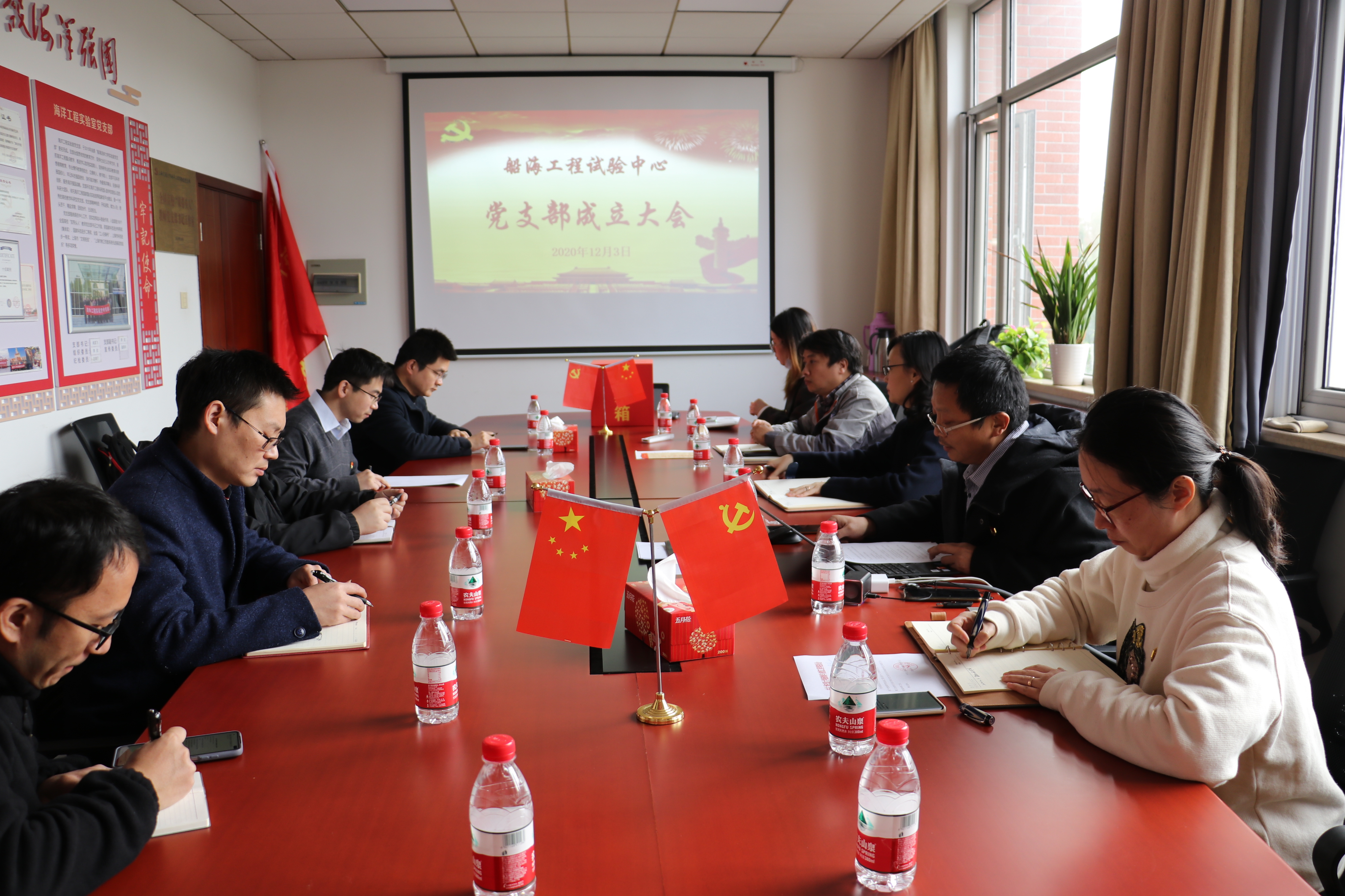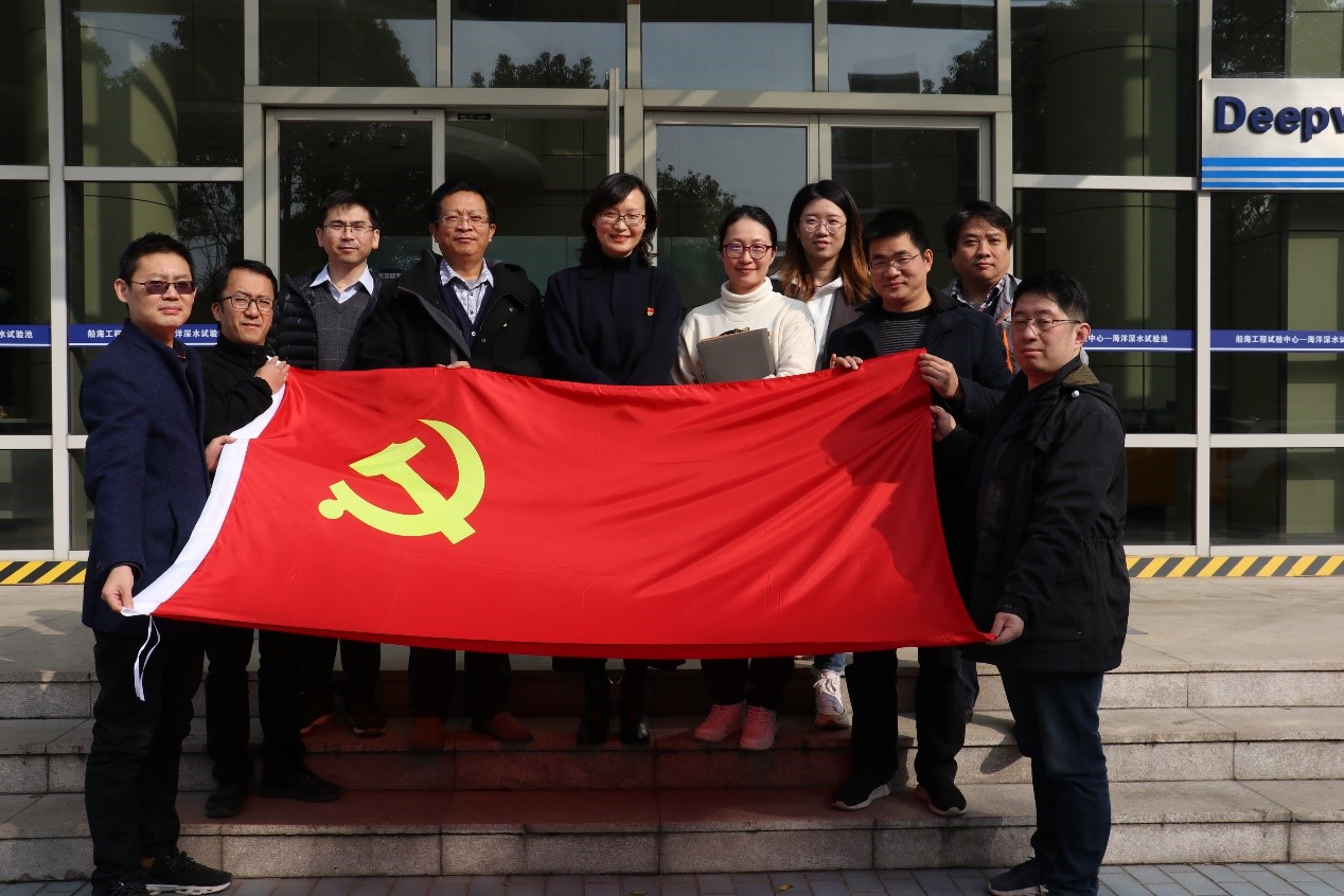2020年12月3日中午,船海工程试验中心党支部成立大会暨第一次党员大会在海洋深水试验池党员活动室隆重举行,船建学院党委书记周薇、党委副书记王喜芳出席会议,船海工程试验中心党支部全体党员到会,会议由党员大会召集人李俊主持。党员活动室内气氛分外热烈、同志们胸前的党徽熠熠生辉,支部成立大会在雄壮的国歌声中开始。