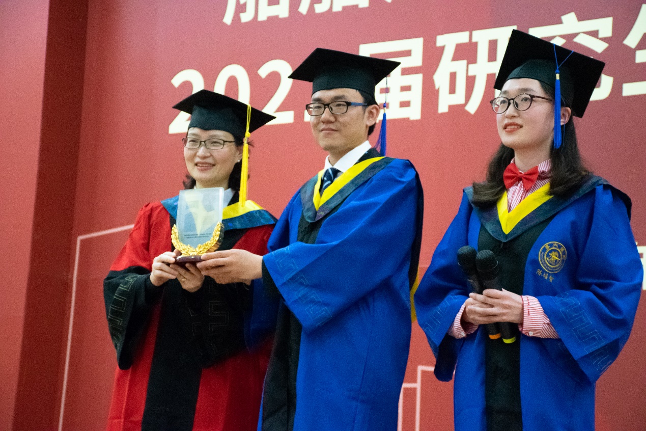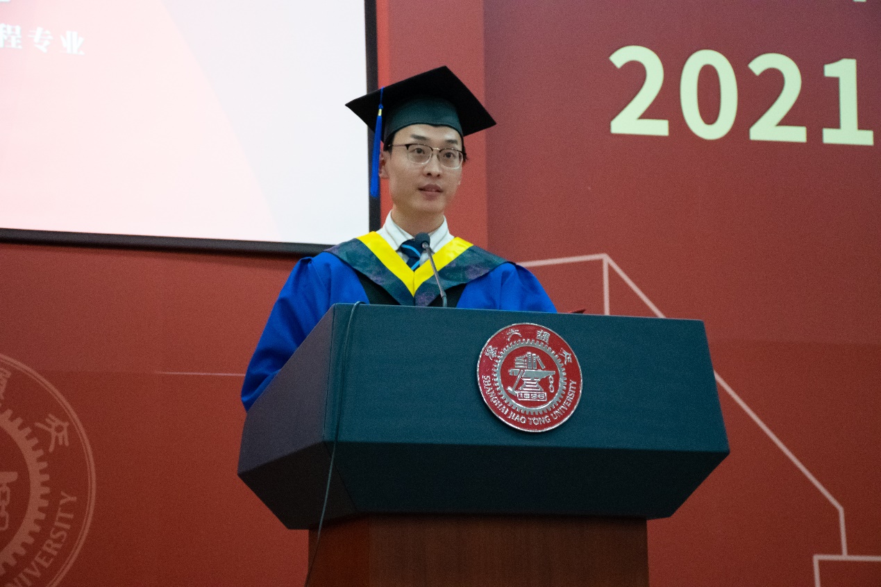 船舶与海洋工程系硕士毕业生于金恒作为2021届毕业研究生代表发言。他将自己所学专业与职业选择相结合,毕业后加入中船集团第701研究所工作。他表示,将用自己的专业知识,为国家船舶事业的发展贡献力量。“以青春为马,与时代共进”是这一代青年学子的铿锵精神。
