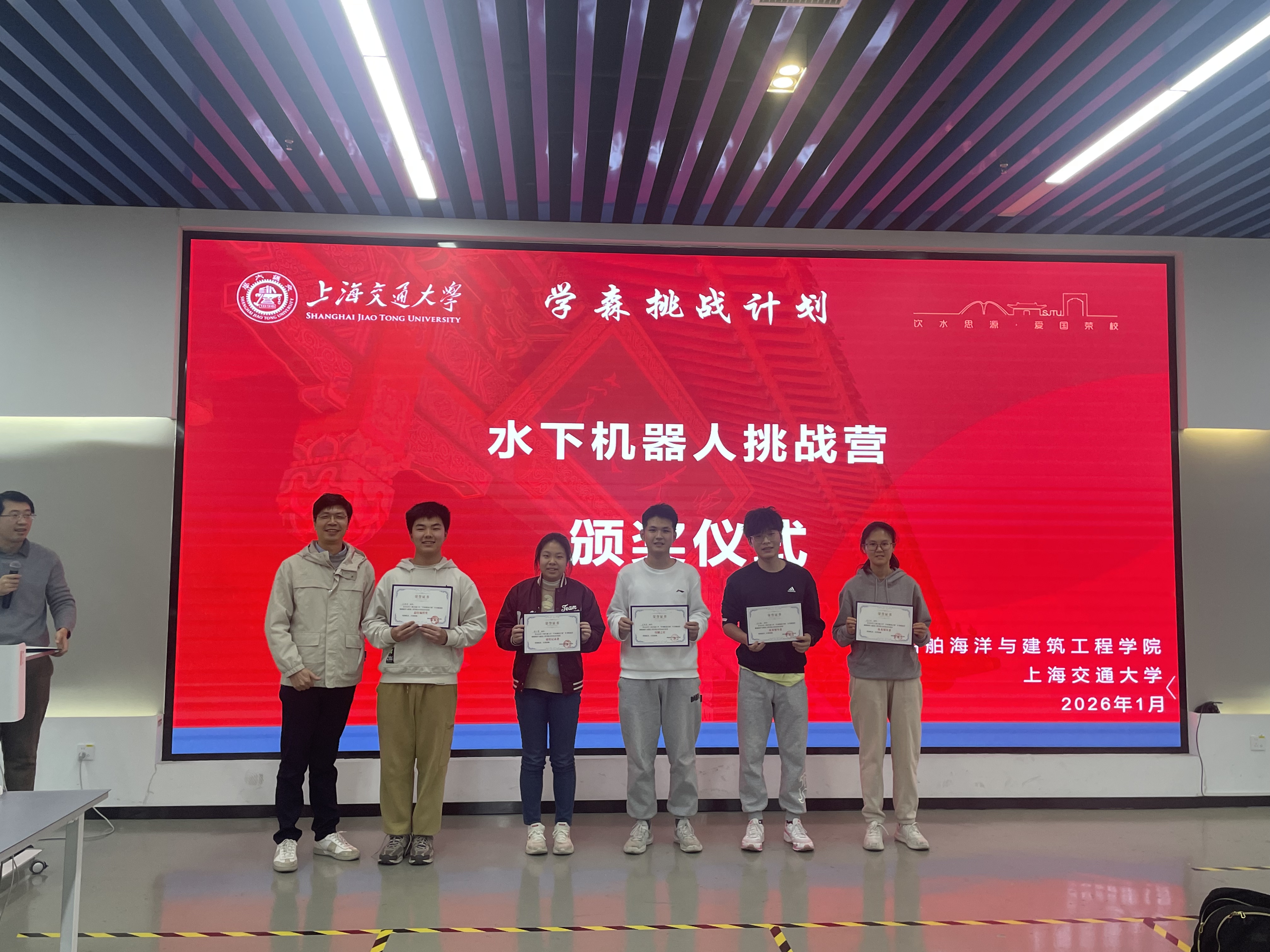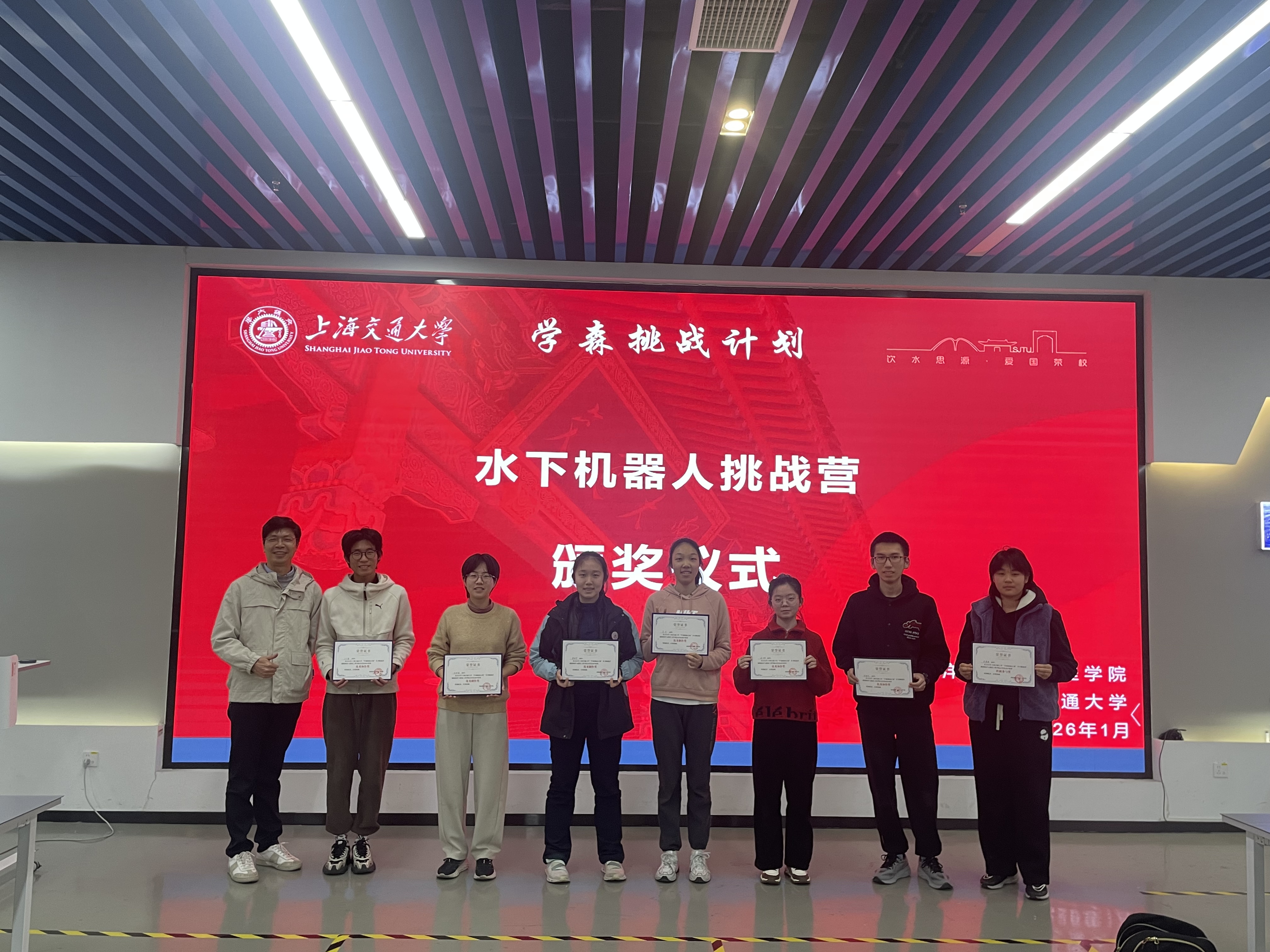 结营仪式上,学员们亲手制作的水下机器人成功完成水中任务,为本次冬令营画上圆满句号。参营学子将带着“敢为人先”的交大印记,奔赴新的求知旅程。“学森挑战计划”将继续深耕拔尖创新人才早期培养,助力更多有志青年叩响未来科技之门。期待与更多未来工程师在思源湖畔相聚,在木兰船建大楼重逢!