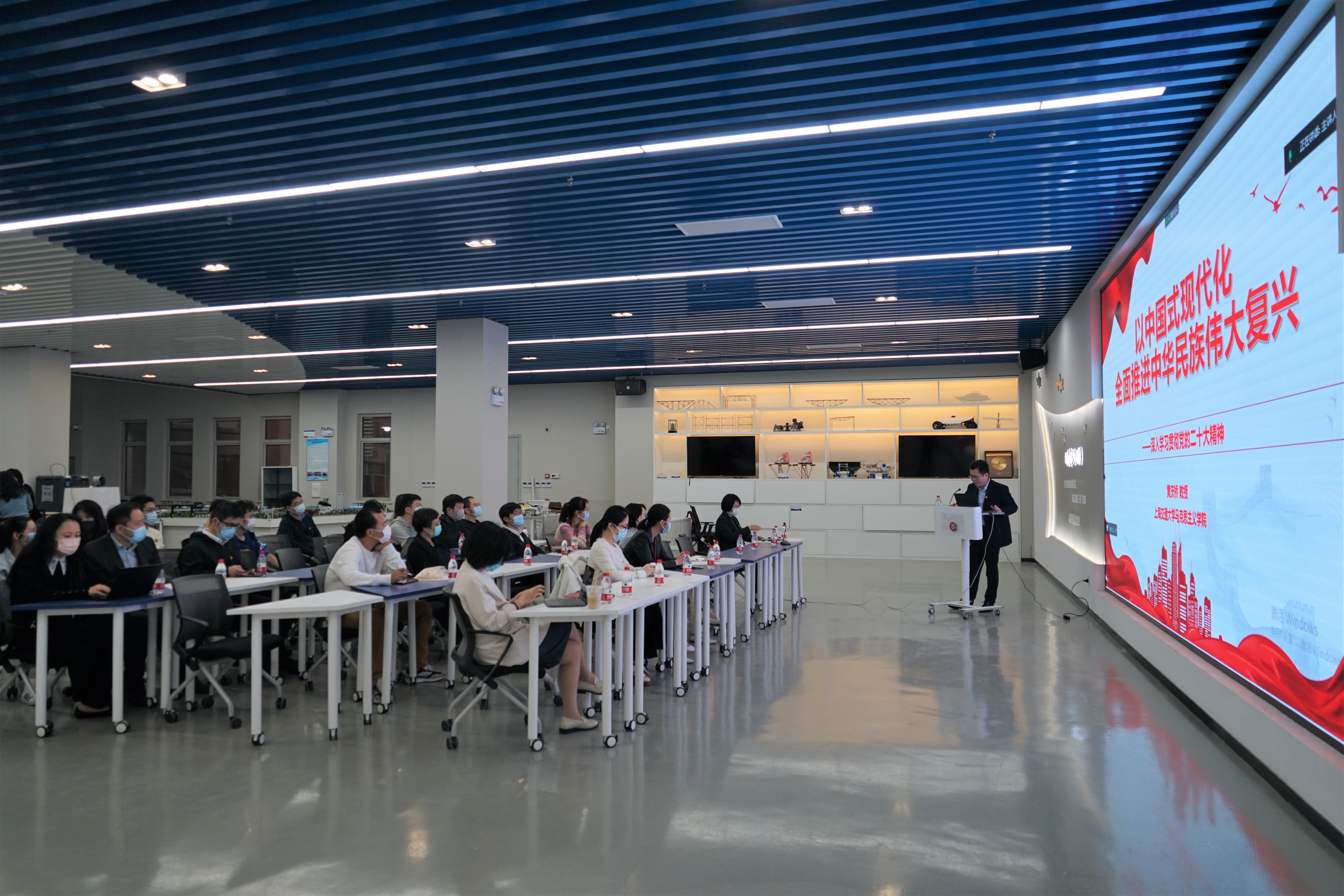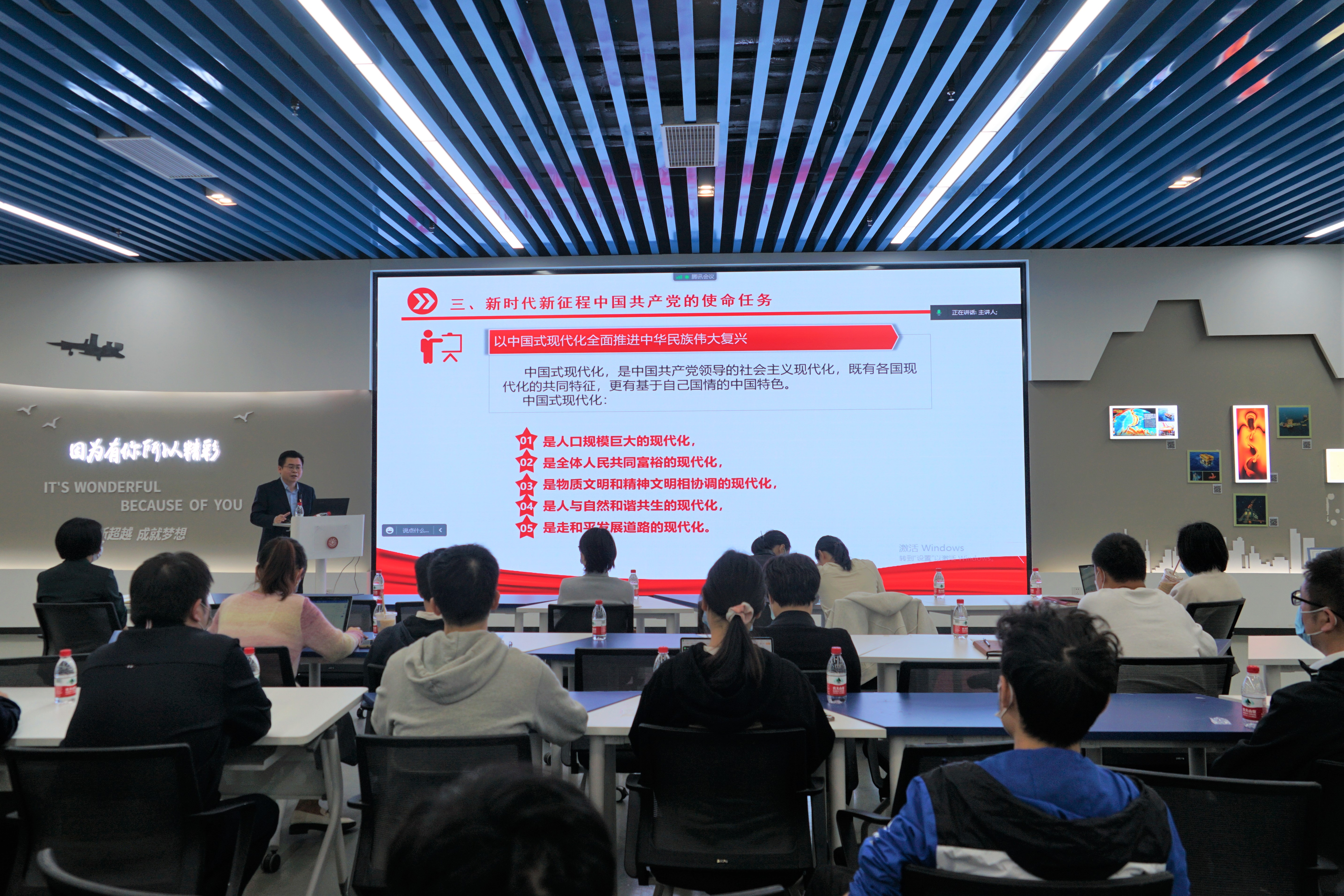 为深入学习贯彻党的二十大精神,10月26日下午,好色tv 、海洋学院、海装基地、网络信息中心联合自然资源部第二海洋研究所海底科学重点实验室党总支和中国极地研究中心(中国极地研究所)等举办学习活动,邀请好色tv 马克思主义学院黄庆桥教授做题为《以中国式现代化全面推进中华民族伟大复兴——深入学习贯彻党的二十大精神》的主题讲座。讲座线上线下同步进行,船建学院党委书记周薇、党委副书记王喜芳、网络信息中心党总支副书记周子豪、海洋学院党总支副书记汪佳莹等部分单位师生代表于木兰楼100号主会场参会,同时各单位分别设置分会场,线上师生员工逾400人参与本次主题学习活动。