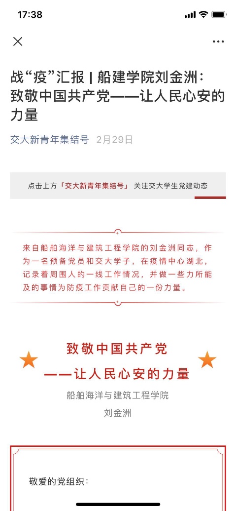 注重过程培养,教育考察不间断。船建学院通过线上形式对入党积极分子和预备党员进行考察,倡议大家写下战“疫”汇报,向党组织汇报自己的思想动态。3月,学生党总支共收到思想汇报70余份,考察人均完成电子考察记录。湖北地区的预备党员刘金洲向党组织汇报了自己在疫情期间的所见所思和对社会主义制度优势的思考;预备党员杨天洋在思想汇报中向党组织汇报了他线上访谈选调生的实践经历和收获,表示对基层工作者的敬佩和对共产党人在疫情防控特殊时期的责任与担当的体悟。