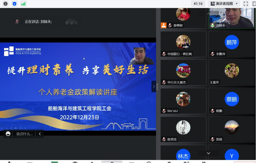 为增加学院教职工对个人养老金最新政策的知晓率,切实把教职工关心的实事办好、好事办实,2022年12月23日中午,船建学院工会举办提升理财素养,共享美好生活个人养老金政策解读线上讲座。学院党委副书...