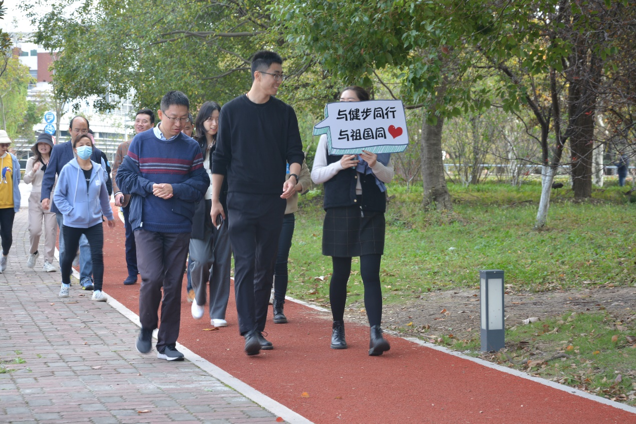 健步走队伍从学院木兰大楼前出发,沿着美丽的校园,一路上,大家三五结伴,带着特色创意口号牌子,欢声笑语,尽情抒怀,阔步向前,一边呼吸着新鲜空气,一边享受着深秋美景带来的惬意,体验着健步运动赋予的乐趣, 更增强了集体的凝聚力、向心力和战斗力。大家通过身体力行,深刻感受到开展“奋斗百年路 启航新征程”健步走活动的意义。