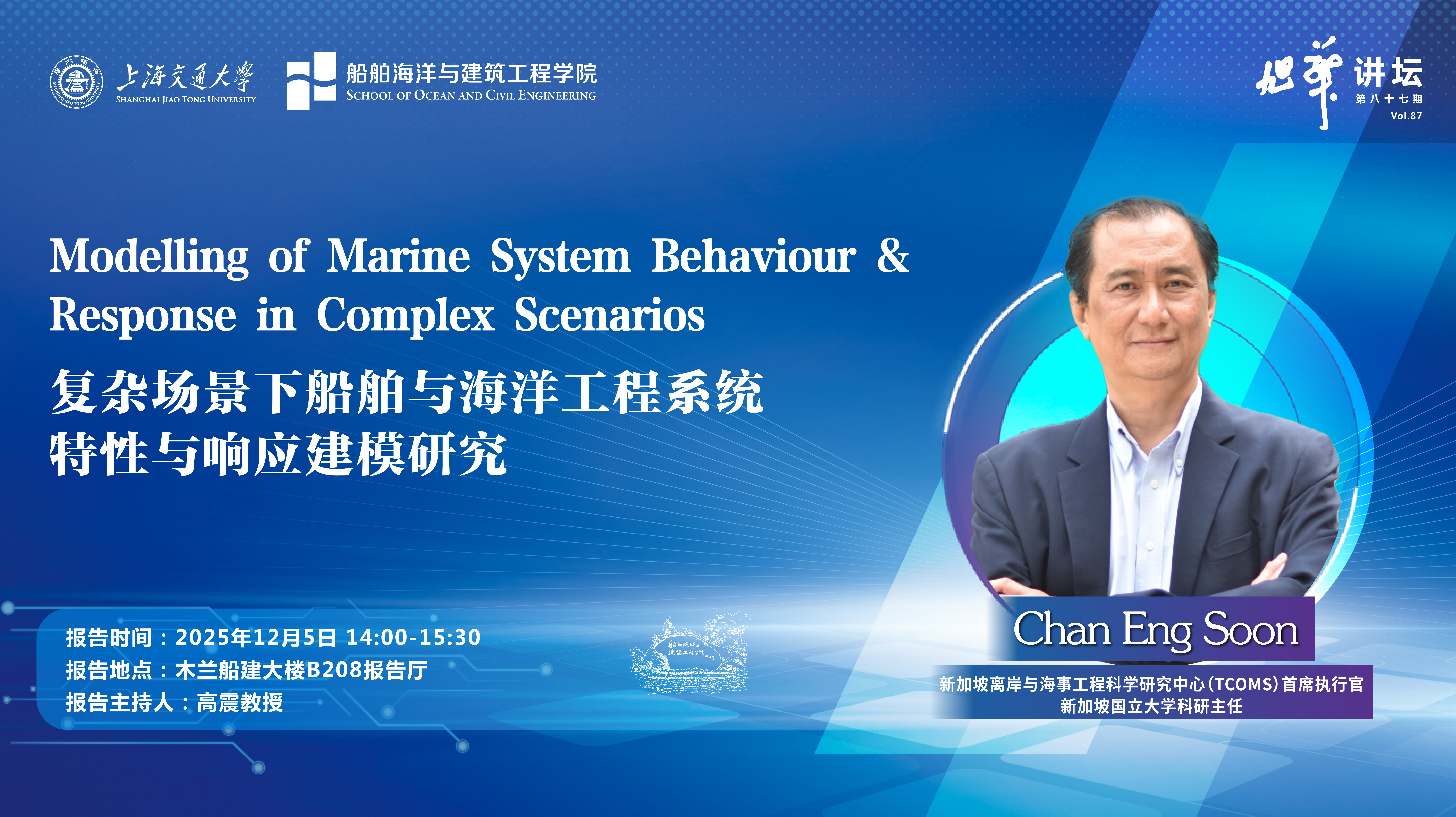 Chan Eng Soon 教授现任新加坡离岸与海事工程科学研究中心(TCOMS)首席执行官,并兼任新加坡国立大学科研主任。