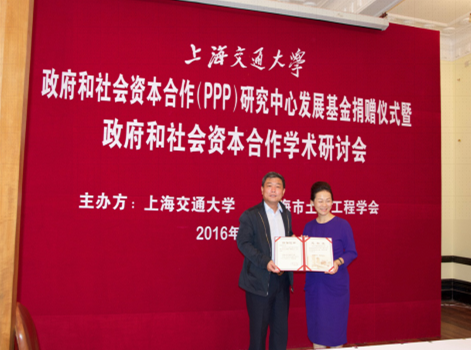 5月21日,上海交大政府和社会资本合作(PPP)研究中心发展基金捐赠仪式暨政府和社会资本合作学术研讨会在徐汇校区举行。副校长张安胜出席,并为上海交大土木与建筑工程系1996届硕士研究生、广州市穗芳建设咨询监理有限公司董事长、广州市穗沪投资管理有限公司董事长、广州市羚羊投资咨询有限公司董事长韩红英女士颁发捐赠证书。校党委宣传部部长胡昊、船建学院党委书记张卫刚、中国农业银行上海分行副行长王世雄,中国(上海)自由贸易区政策研究局局长张湧等出席仪式。