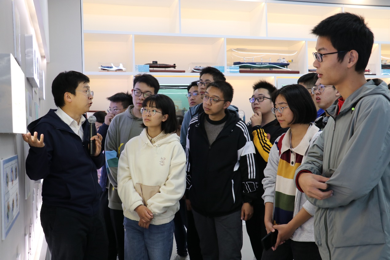 会前,团委书记赵恺带领同学们参观学创中心船建分中心大厅及虚拟仿真空间,详细介绍了学院科研成果和学生创新实践项目。