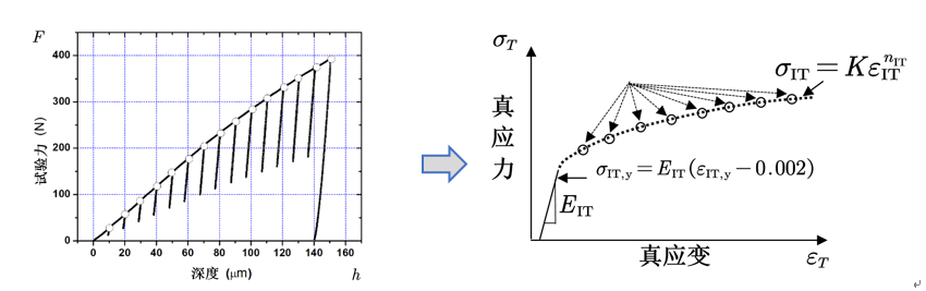 仪器化压入试验标准是近年来备受国内外关注的焦点,《金属材料-仪器化压入法测定压痕拉伸性能和残余应力》规定了采用仪器化压入试验测定金属材料压痕拉伸性能和残余应力的方法。通常材料强度必须制作标准试样通过拉伸等试验获得。该方法只需采用球形压头压入试样表面,测量压入试验力-深度曲线,通过该曲线来获取压痕屈服强度、抗拉强度和应变硬化指数,来表征金属材料的拉伸强度(图1)。其次采用维氏压头压入试样表面,通过测量有应力与无应力状态下金属材料的压入试验力差,获得金属材料试样或构件(如焊接部位)的残余应力分布。