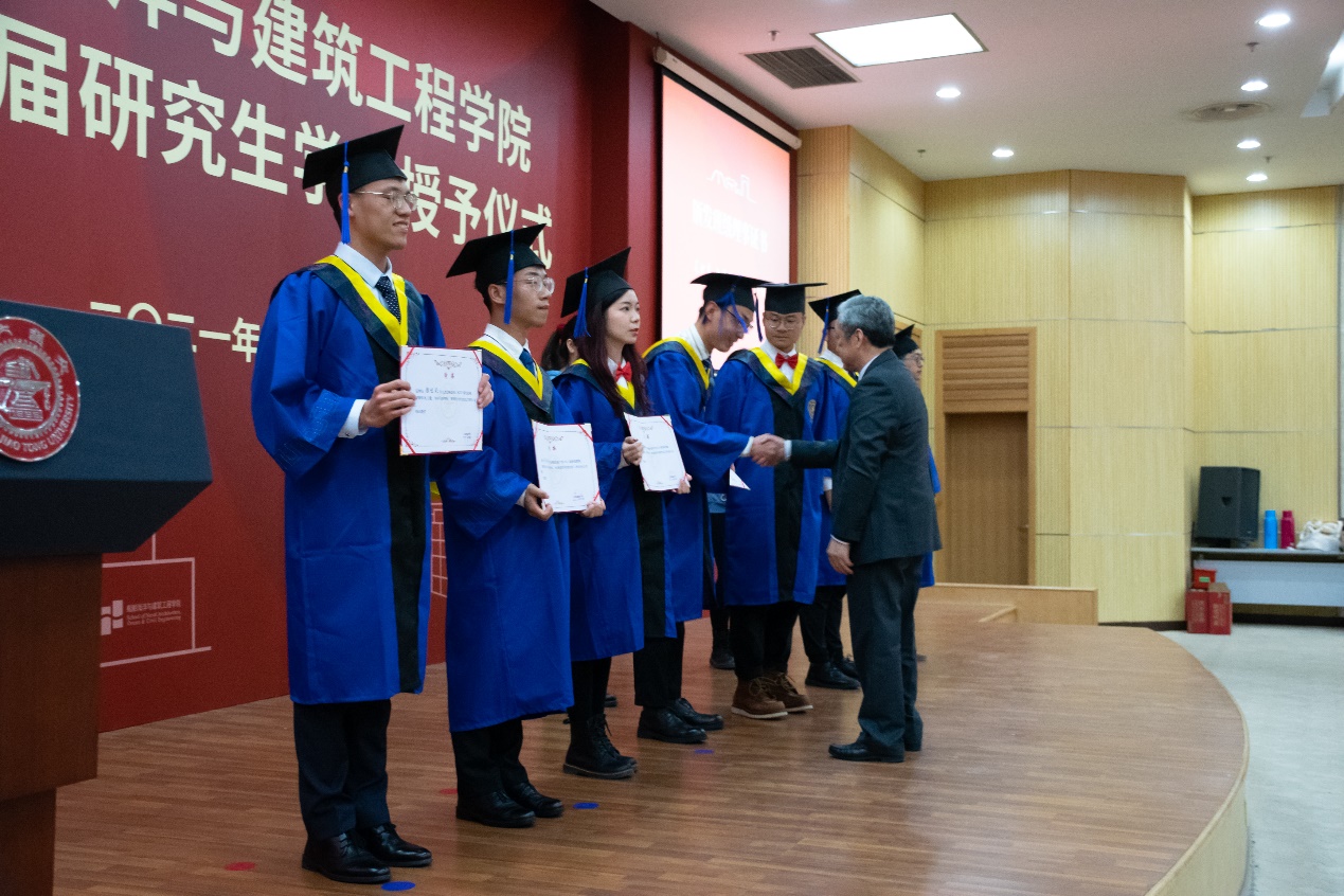在激昂的乐声中,2021届硕士毕业生学位授予仪式正式开始。党委书记周薇,副院长杨健、薛鸿祥、王本龙,导师代表周岱,以及王鸿东、刘铸永、陈锦剑、杜守继等各系老师共同为毕业生们颁发了学位证书。全体毕业生依次上台,接受学位并与导师合影留念。
