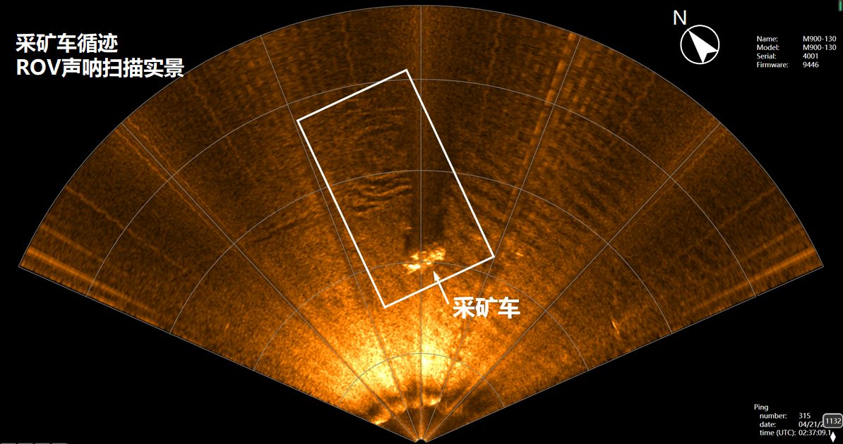 为满足未来海底矿产资源工程开发的需要,项目组前瞻性研发采矿车智能自主行进技术,实现采矿车海底行进过程中的闭环反馈控制,基于规划的作业路径和水下精确定位信息,实时、智能控制采矿车行进方向、位移和速度等运动姿态,首次实现采矿车海底大曲率曲线路径高精度跟踪。图2为采矿车实时行进轨迹与S形规划目标路径对比,两者高度吻合,最大跟踪误差仅0.40m。图3为ROV声呐测得的海底试验现场,采矿车S形轨迹清晰可见。