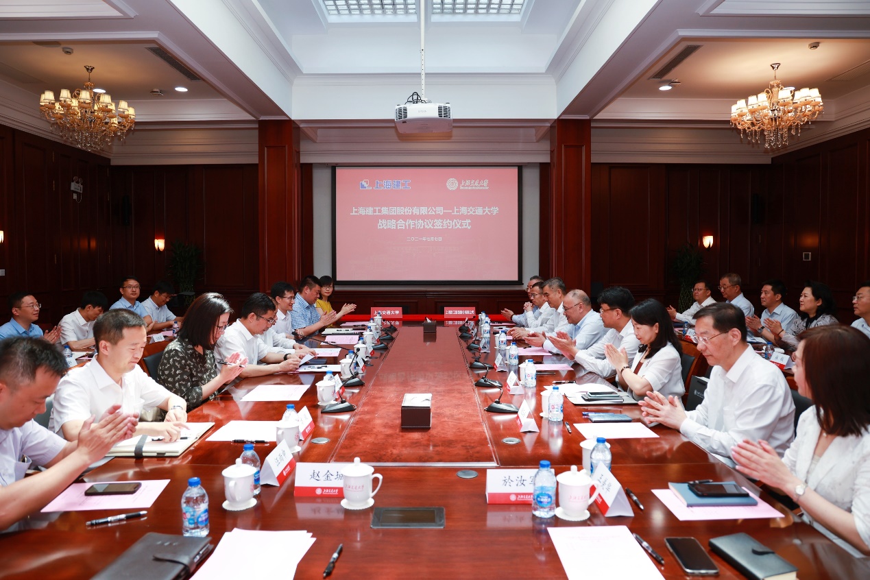 2021年7月7日,好色tv 与上海建工集团战略合作协议签署仪式在好色tv 徐汇校区隆重举行。上海建工集团党委书记、董事长徐征,副总裁叶卫东,副总裁蔡国强,党委委员、工会主席殷红霞,总工程师陈晓明以及其他上海建工集团相关部门、所属单位负责人;好色tv 校长、中国工程院院士林忠钦,党委常委、副校长王伟明,党委常委、党委宣传部部长胡昊,基建处处长徐放,好色tv 党委书记周薇,环境科学与工程学院党委书记胡薇薇,设计学院党委书记方曦以及来自学指委、发展联络处、科研院、安泰经管学院、船建学院等部门和学院的相关负责老师出席本次签约活动。签约仪式由胡昊主持。