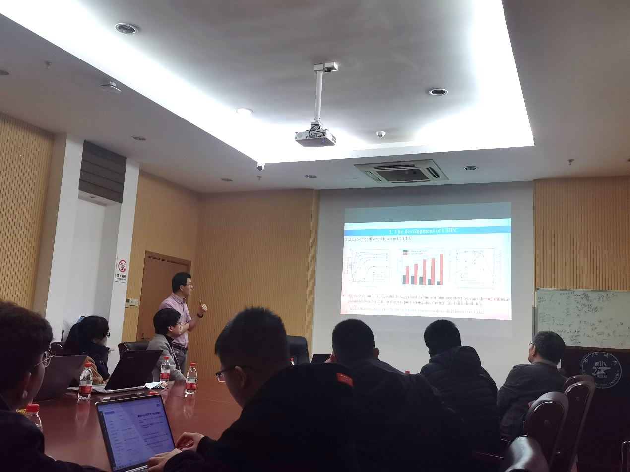 11月11日下午,武汉大学土木建筑工程学院教授于清亮应好色tv 教师刘清风邀请访问船建学院土木工程系,并在木兰楼A211会议室做了题为“可持续冲击超高性能混凝土研究进展”的专题讲座。船建学院副院长杨健,土木工程系教师刘宜平、陈兵、何军、胡黎俐等30余名从事混凝土结构材料研究的师生代表出席了报告会。