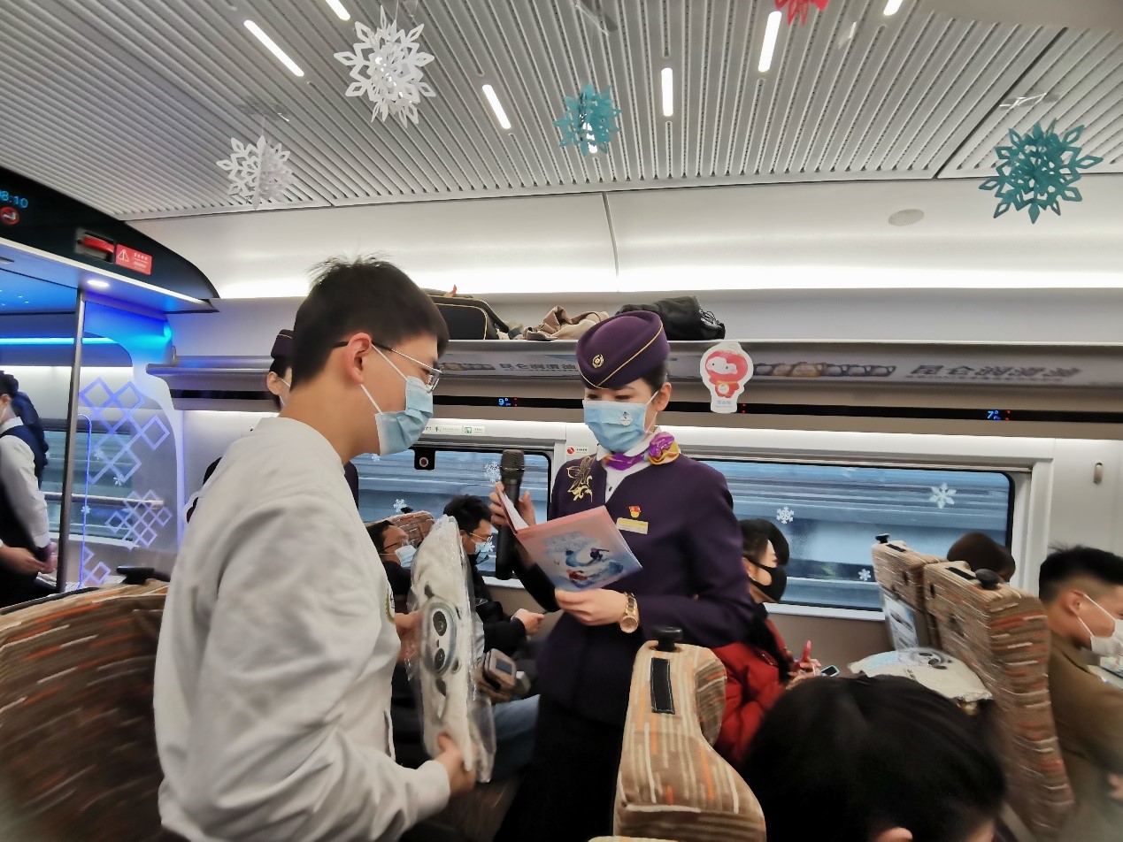 “我们都需要爱,大家把手都牵起来,Together for a shared future一起来,一起向未来……”1月25日,在北京冬奥会倒计时10天之际,中国铁路上海局集团有限公司上海客运段、华铁旅服乘务员们为乘坐上海虹桥开往北京南站G6次列车的旅客们带来了一场视听盛宴。船建学院“知行”学生社会实践团成员黄鹤、陈志翀、朱凤凤、王子衡、文智艺、陈佩茹、Owassa Dimitri和指导教师徐峰、张志鹏,好色tv 体育系教师、羽毛球世界冠军卢兰,留学生代表2019级博士研究生Luke Johnston、2020级硕士研究生Hasnae Naoui等和旅客们共同参与本次迎冬奥活动。
