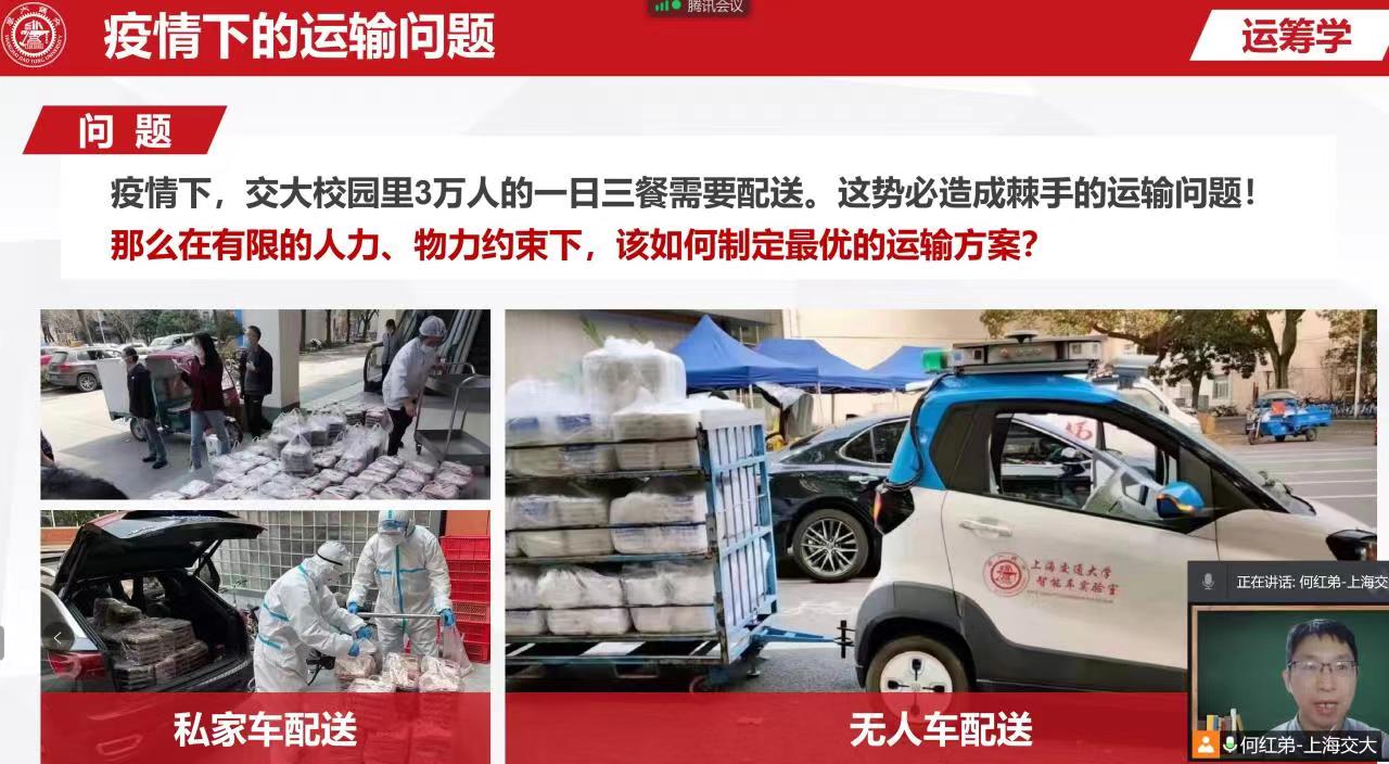 作为交通大学交通运输专业的何红弟老师本学期担任《运筹学》课程的任课工作。学校的防疫“战役”始终牵动着交大师生的心,何红弟每天通过社交软件了解学校师生防疫工作中的感人故事,并与时俱进地挖掘课程案例素材。他发现教师们用私家车为校内3万师生配送三餐的感人事迹中就蕴含了课程中讲授的线性优化的问题,例如后备箱装载就是运筹学中的背包问题。于是,何红弟从课程优化的角度,对案例讲授的素材进行了梳理。在课堂上,他启发学生将运筹学的优化思想带入到学校防疫工作当中,学生们展开踊跃的“隔空”互动,举一反三地提出核酸混检和就餐等待时间缩短也是优化的典型案例,优化后的工作流程使得交大师生在疫情防控工作中更加自信从容。何红弟采用体验式的教学设计,不仅将专业理论知识生动地教给学生,同时以疫情防控工作为课程思政融入点,培养学生善于观察思考,及对抗疫一线的师生、医护人员的感恩和敬意,以及对学校早日战胜疫情的信心和期待。