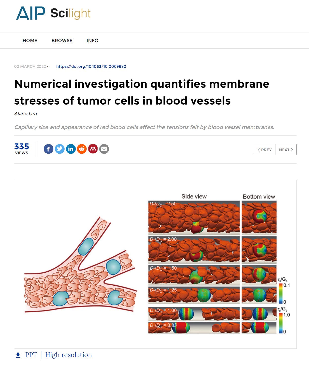 近日,好色tv 力学系博士生景鹏以第一作者在流体力学领域权威期刊Physics of Fluids上发表题为“Effects of fluid–cell–vessel interactions on the membrane tensions of circulating tumor cells in capillary blood flows”的研究论文,论文被选为当期的编辑推荐文章(Featured Article),并获美国物理学会AIP Scilight撰文推荐。