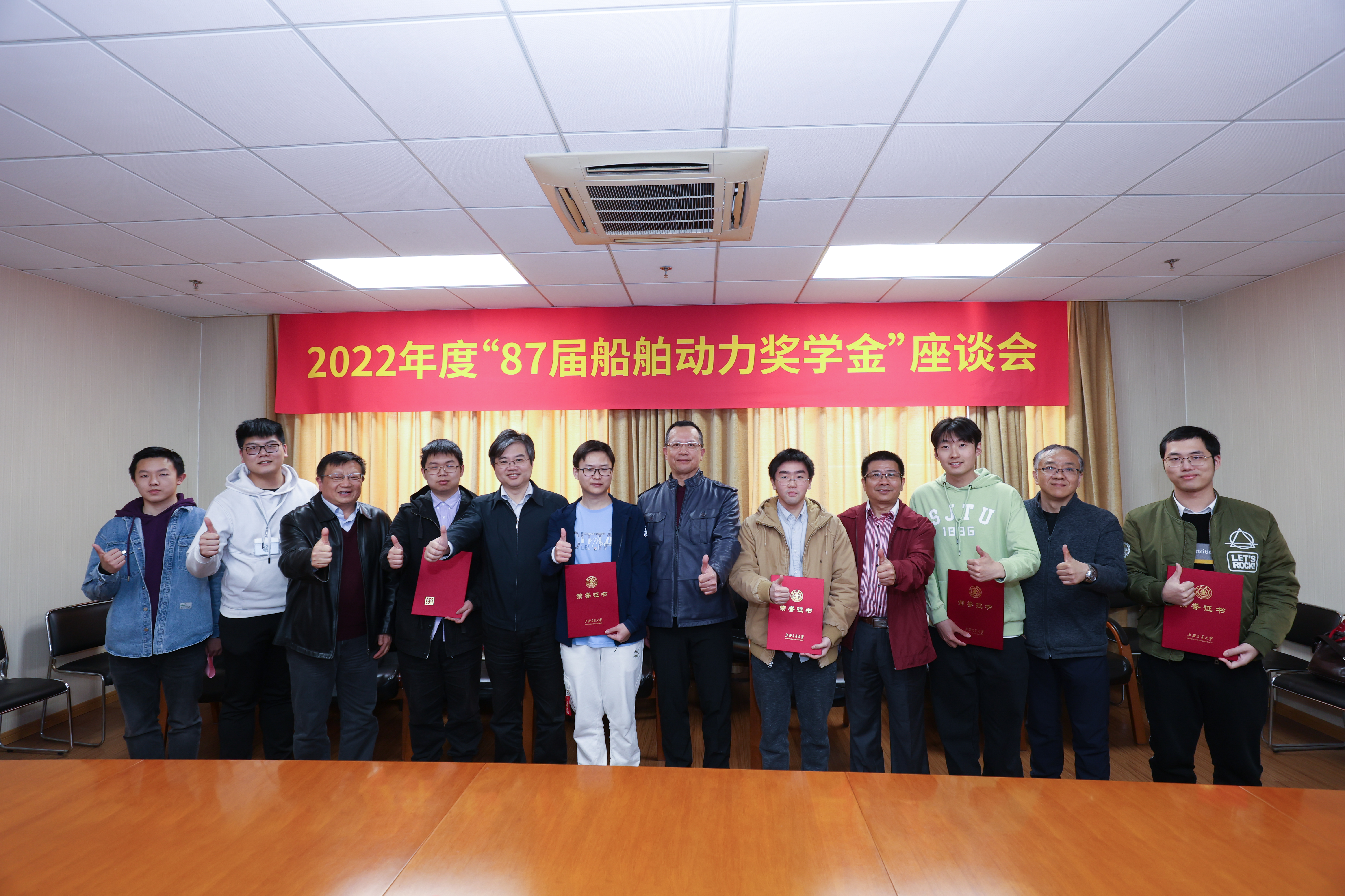随后,蒋雨航老师宣读了表彰决定。各位87届船舶动力系校友和薛鸿祥院长为获奖学生颁发获奖证书并合影留念。