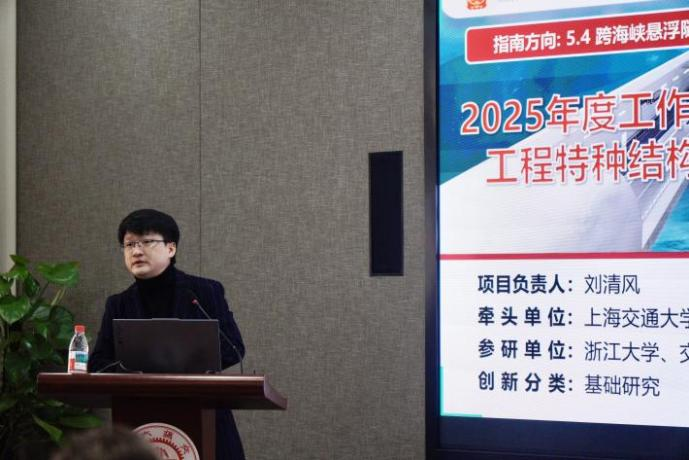 项目负责人刘清风代表项目组作年度工作汇报。他汇报了项目立项背景与年度核心目标,介绍了本年度在学术成果与人才培养方面完成考核指标的总体情况。围绕特种结构材料的设计与制备、极端浪流作用下的结构安全分析、以及耐久性劣化机理与防护技术三个方向,向专家组详细汇报了项目在理论构建、试验探究及模型开发方面取得的阶段性进展,并展望了下一年度在关键试验验证与长期性能预测方面的攻关计划。