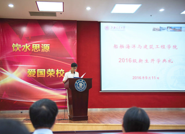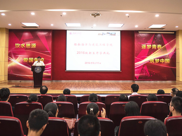 9月11日下午,船建学院2016级新生开学典礼在木兰船建大楼A200报告厅隆重举行。学院党委书记张卫刚,院长杨建民,副院长赵金城、夏利娟,党委副书记杨建军,各系主任、行政班负责老师、全体教学秘书和思政教师以及2016级全体新生出席了典礼。开学典礼由张卫刚主持。