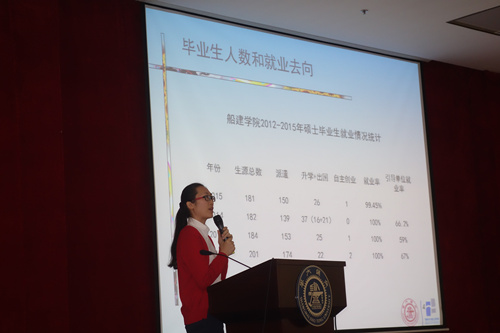 薛云云首先介绍了船建学院毕业研究生近年就业情况,详细分析了往届毕业生就业率、就业去向和签约进度,让同学们对各自专业的就业情况有了大致的把握。随后她结合学校就业中心工作,着重向同学们介绍了引导单位、选调生、自主创业、出国深造后引进回国、公务员等去向,以更好的应对“史上最强裁员潮”背景下严峻的就业形势。同时,薛云云详细说明了2016届毕业研究生就业工作要点及注意事项,特别围绕诚信、礼仪、职业生涯规划等方面和同学们做了探讨。杲光伟随后就相关政策的变更和解读进行了补充。
