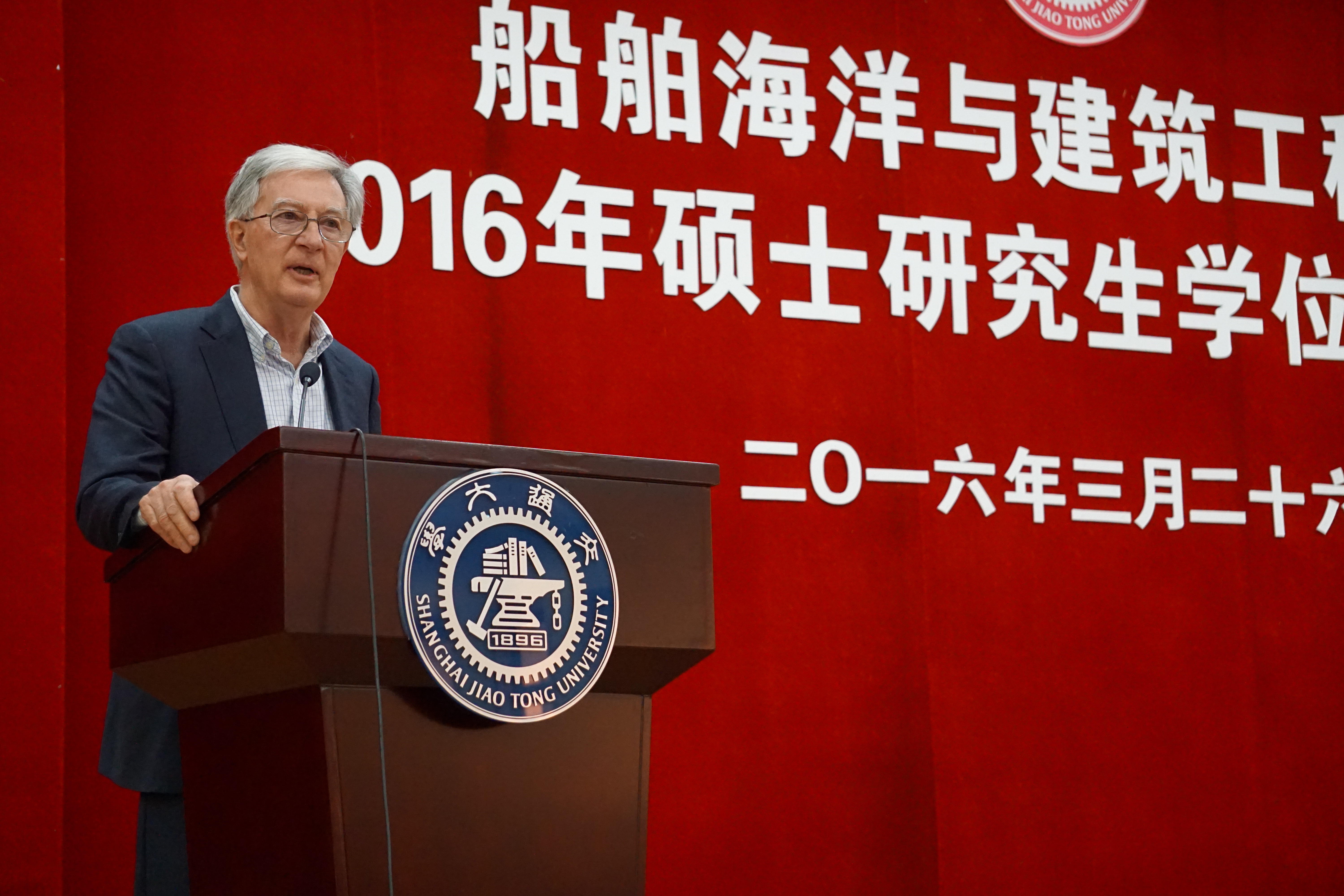 船舶与海洋工程系教授Francis Noblesse作为教师代表发表了讲话。他向全体毕业生表示了祝贺,并祝愿同学们在未来学习生活中一路顺风。同时,Noblesse教授以自己求学美国和在交大教书的亲身经历,鼓励同学们坦然接受生命的无限可能,勇敢迎接不可预期的挑战。