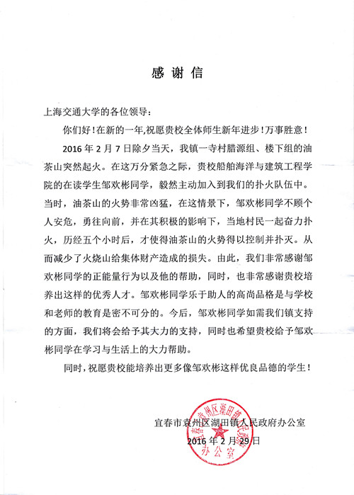 2月7日除夕当天,江西省宜春市湖田镇油茶山突发火情。火势凶猛,蔓延迅速,情况非常危急。路过该处的船建学院2015级本科生邹欢彬奋勇上前,主动加入救火队伍,历经五小时与山火的搏斗,终于控制火势并扑灭,减少了山火对集体财产造成的损失。 3月下旬,湖田镇人民政府办公室寄来感谢信,向邹欢彬的英勇行为表示了衷心的感谢。
