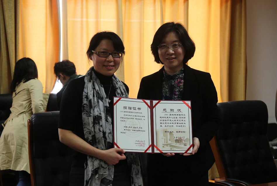 同一时刻,95届船海系校友捐赠仪式也在木兰船建大楼A1006举行,黄亚雄、唐震峰、庆宇峰、葛春花等95届校友及部分船舶与海洋工程系本科二年级学生出席了捐赠仪式,仪式由船舶与海洋工程系系主任汪学峰主持。学院党委副书记李巍与校友代表葛春花共同签署了捐赠仪式,并向校友们颁发了捐赠证书。