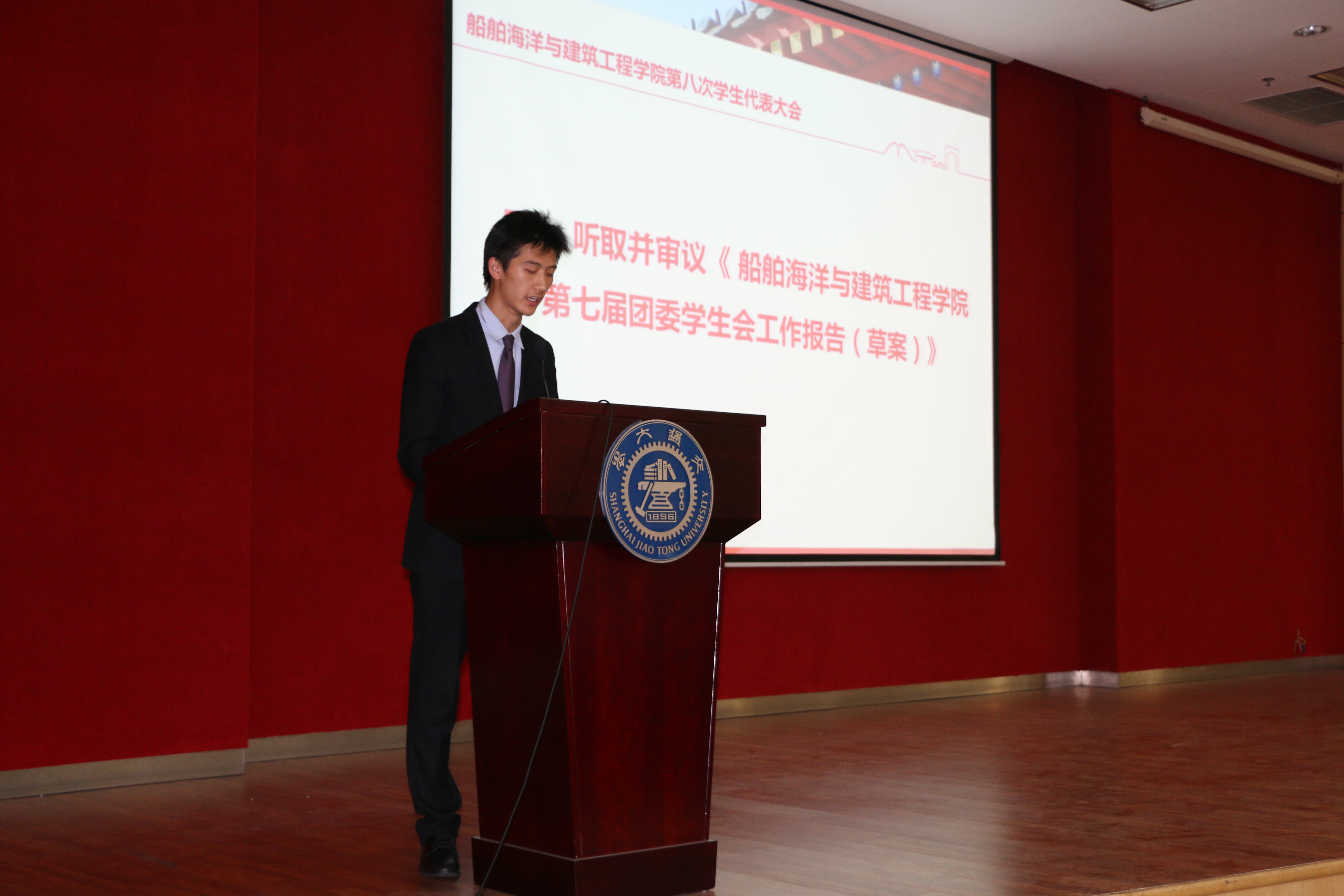 船建学院第七届团委学生会主席张建新代表第七届团委学生会向大会作题为“星海扬帆、筑梦远航”的工作报告。报告对第七届团委学生会的工作作了全面回顾和总结,并对未来船建团委学生会的发展提出了新的展望。