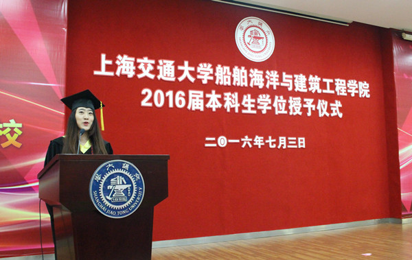 船舶与海洋工程系毕业生代思宇代表船建学院全体2016届本科毕业生发表了讲话。她用一个个鲜活的场景带领毕业生们重温了大学的美好时光,并结合自己的切身经历,展现了船建学子充满梦想与挑战的求学之路。同时,她代表全体毕业生向含辛茹苦的父母表示了诚挚的感谢,并以“无愧交大、无愧青春”的誓言与全体毕业生共勉。