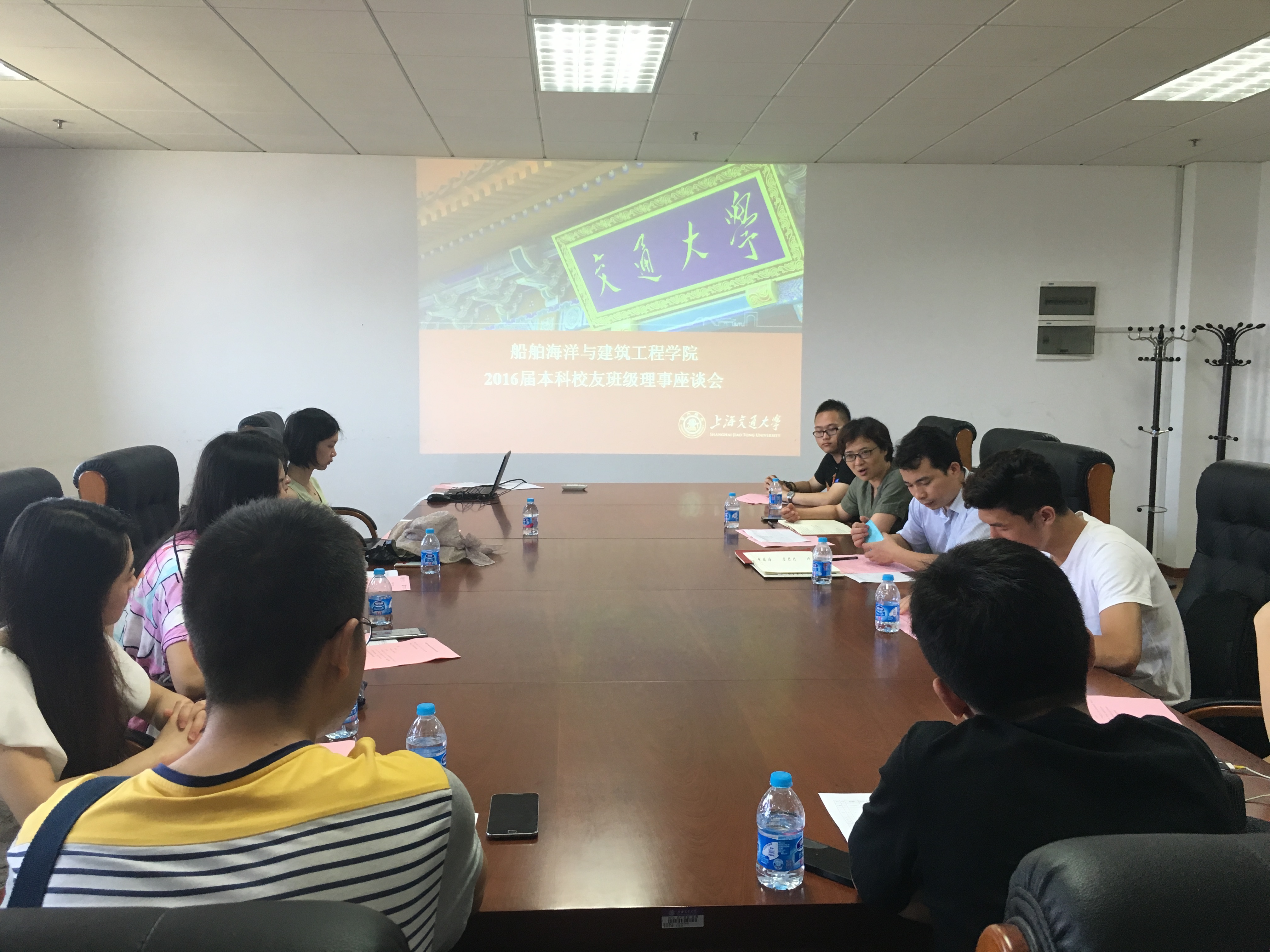 6月30日上午,船建学院2016年本科校友班级理事座谈会在木兰船建大楼A1006会议室举行。学院党委副书记杨建军、院长助理朱惠红、校友联系人魏燕、船建学院2016年本科9位班级理事出席了本次座谈会。