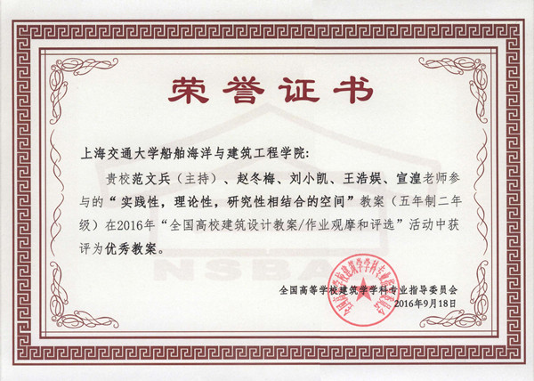 会上公布了2016年“全国高等学校建筑设计教案和教学成果评选”的结果,上海交大船建学院建筑学系取得了优异成绩。建筑系选送参评的1套教案及3份学生作业(建筑学二年级)全部获奖,获奖率100%,与全国其它5所高校并列第一。(该评选按年级只评优秀奖,不分等级)