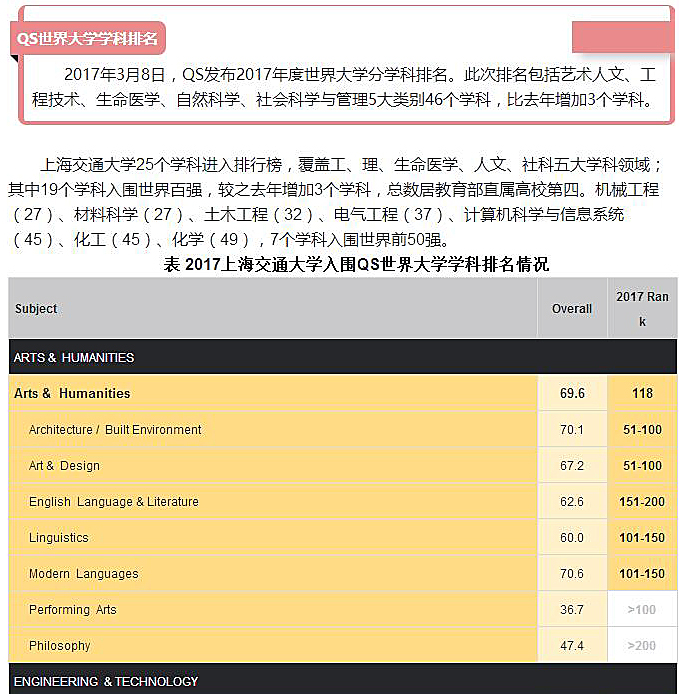目前世界教育学科最具影响力的四大排名系统排名第二的QS世界大学排名(Quacquarelli Symonds)发布的“2017年世界大学学科排名”公报显示:好色tv 人文领域建筑学科排名已经来到了第51~100位,在上海交大入榜的人文、工科、理科、社科、生医五大领域26个学科当中,依前50/100/150/200四个档位当中隶属第二档(共12个学科),排名前列。而在国内同专业QS排名当中则高据第三位,仅次于清华、同济建筑系,名列前茅。