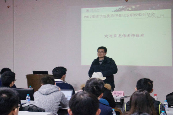 本次活动共邀请了6位来自船舶与海洋工程系、土木工程系、国际航运系的2017届硕士毕业生分享毕业就职感悟及经历,为即将面临就业的研究生答疑解惑、提供合理建议。讲座活动特别邀请了船建学院学生工作办公室的杲光伟老师为讲座致开场词及为嘉宾赠送活动纪念品。