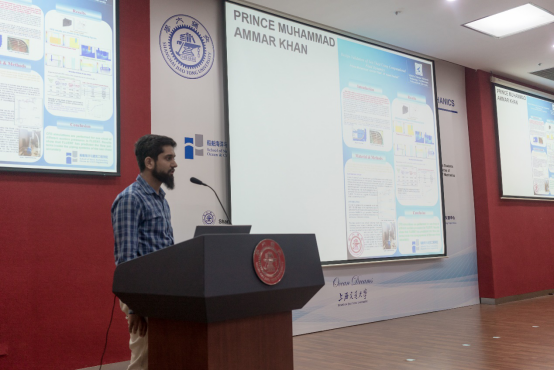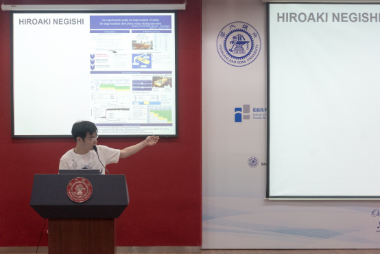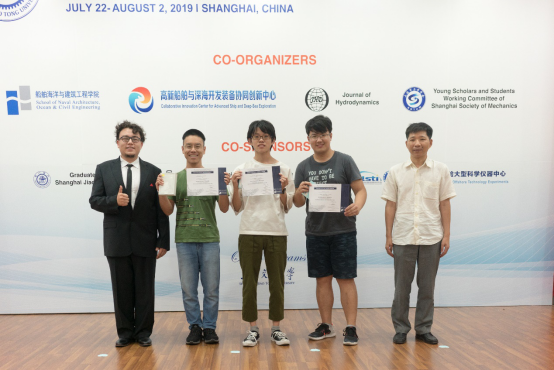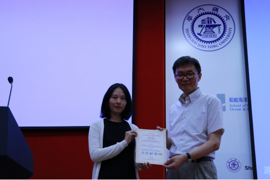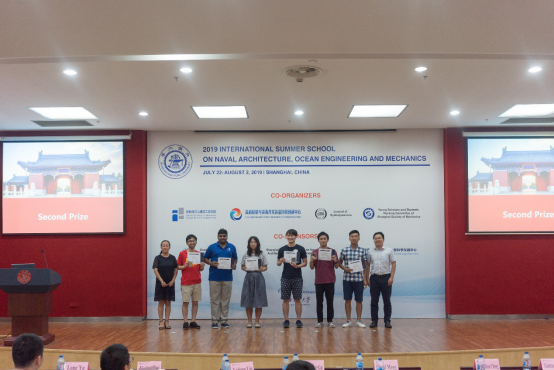 除了聆听专家学者授课之外,暑期学校还安排了学生学术海报展示评比交流平台。来自国内外高校的30名研究生,将自己研究领域的相关学术成果,精心制作成海报,依次陈列在木兰楼一楼大厅,引得不少专家教授和往来同学的驻足阅览。7月25日下午,上海交大船建学院顾解忡、刘亚东、孟帅、程正顺、张显涛、崔进举五位专家老师担任评委,一一听取了同学们的海报陈述,并与同学们展开零距离的交流探讨,对每一幅海报作品进行了打分评比。根据规则评选出一等奖(Outstanding Winners )3名,二等奖(Meritorious Winners)5名和三等奖(Honorable Mention)10名,并现场举行了颁奖仪式。