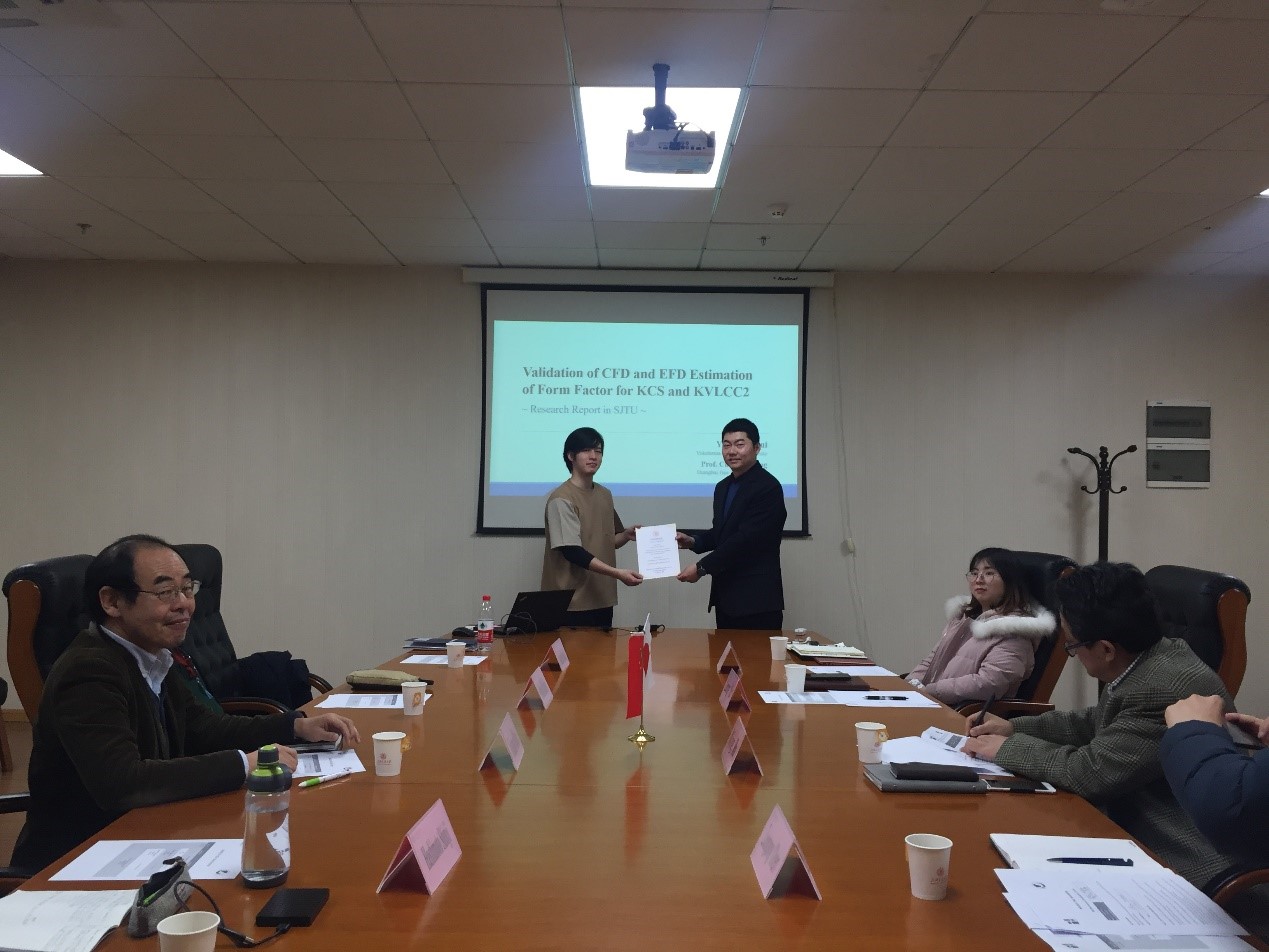 12月26日2019年度SJTU-YNU Joint Workshop暨日本横滨国立大学短期(三个月)交流交换生结业典礼在木兰船建大楼A1008会议室举行,船建学院导师代表马宁老师、陈作钢老师、余龙老师、顾解忡老师和学工办史舒婧老师,学院船海系、土木系部分学生代表出席结业典礼,横滨国立大学(YNU)的Takanori Hino和Motohiko Murai两位教授专程前来参加结业典礼和学生答辩。