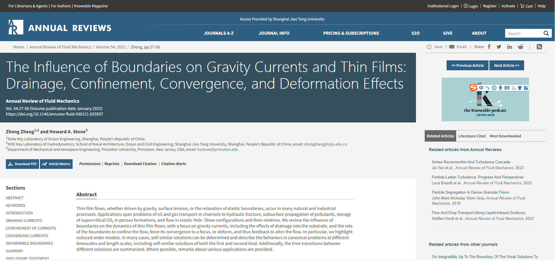 船建学院郑重博士受邀在《流体力学年鉴》 发表关于异重流及液膜的论文